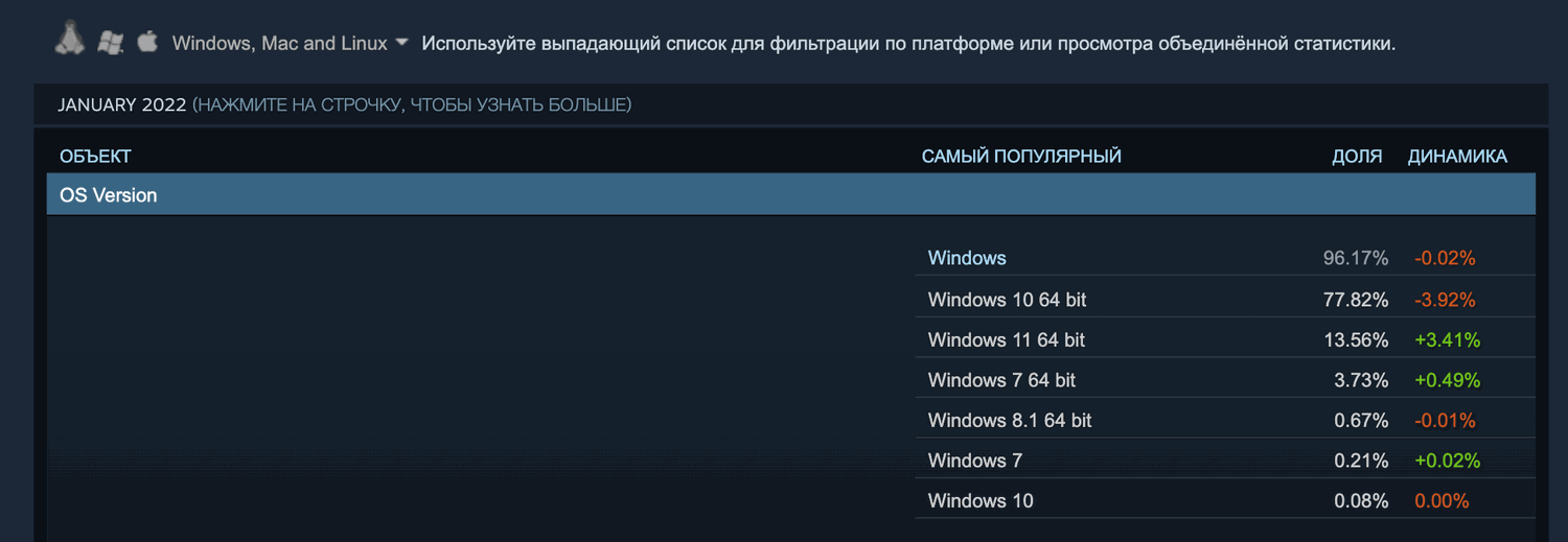 Значение 13,56% может быть немного высоким, потому что Steam — это игровая платформа, а геймеры часто заинтересованы в использовании новейших и лучших приложений на своих системах. Игровые ПК также могут иметь более высокую степень совместимости с Windows 11, чем неигровые устройства, поскольку современные игры требуют больших денежных затрат и более качественного оборудования.