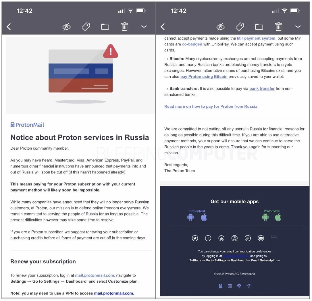 ProtonMail призывает своих российских пользователей поторопиться и продлить свою подписку, поскольку с российского рынка уходят несколько сервисов обработки платежей, включая Mastercard, Visa, American Express и PayPal