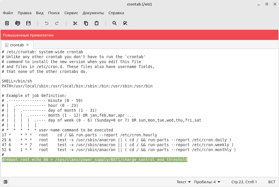 @reboot root echo 80 > /sys/class/power_supply/BAT0/charge_control_end_threshold