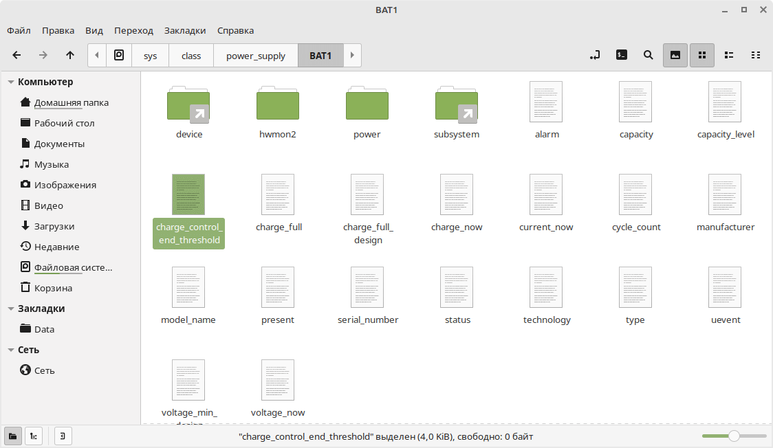 - Нас интересуют каталоги BAT0 или BAT1. Откройте каталог, одним из файлов внутри каталога должен быть файл «charge_control_end_threshold». Именно его значение мы поменяем.