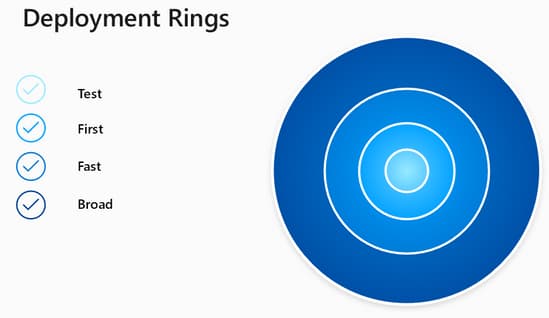 «Тестовое кольцо» будет содержать минимальное количество устройств, «первое кольцо» — около 1% всех конечных точек, которые необходимо поддерживать в актуальном состоянии, «быстрое кольцо» — примерно 9%, а «широкое кольцо» 90% всех устройств.