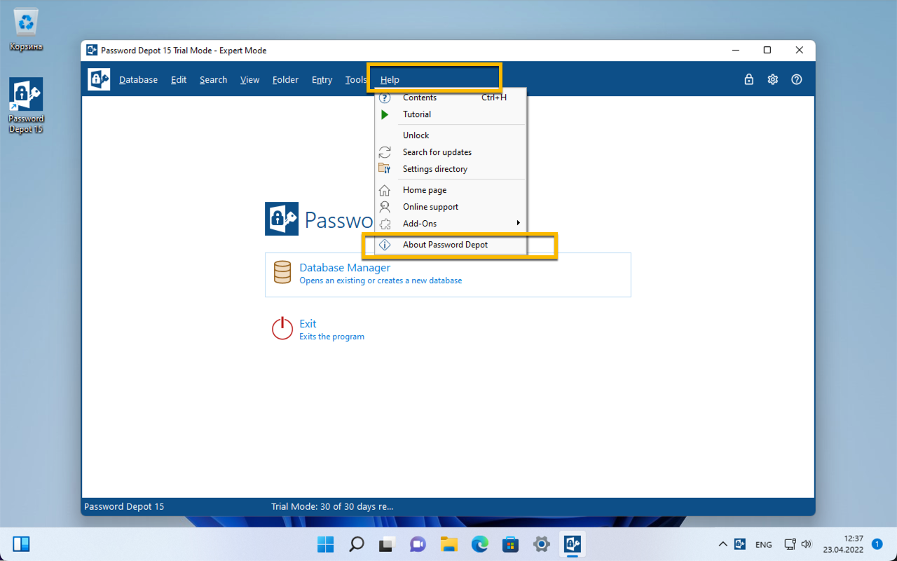 - Перейдите в меню Help > About Password Depot.