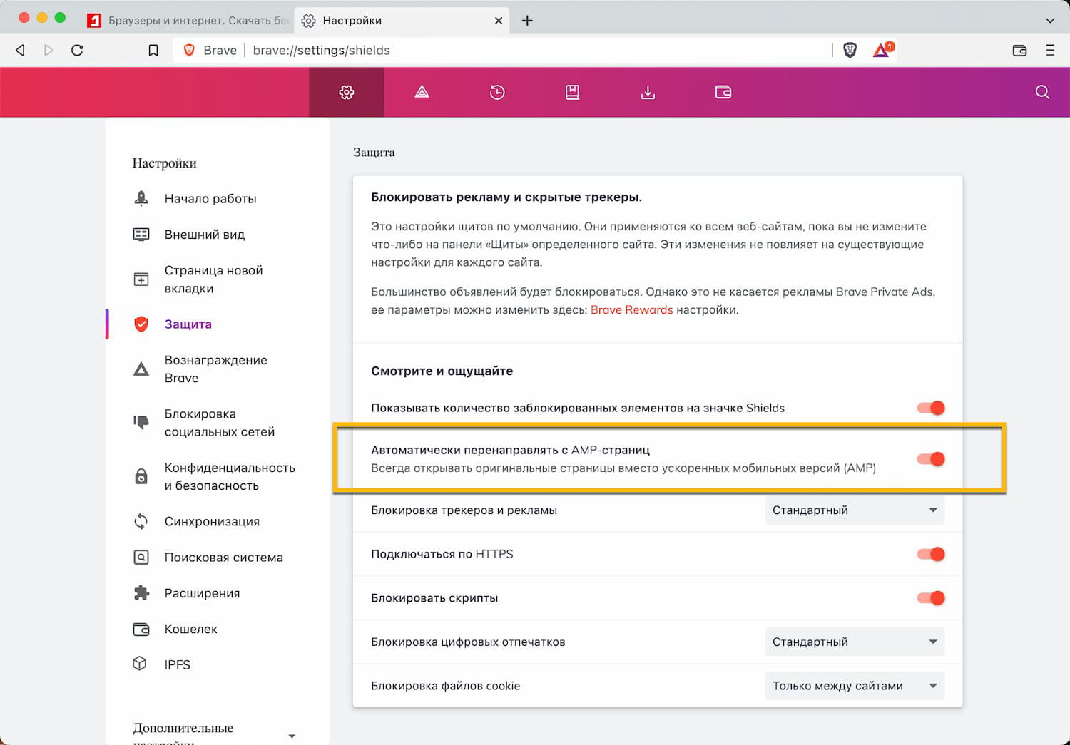 Brave Щит (Brave Shields) — центр управления защитой браузера. Он используется для блокировки рекламы, трекеров, попыток снятия цифрового профиля и других методов отслеживания в Интернете.