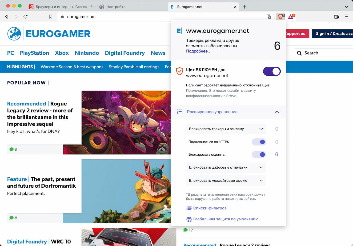Панель Щит отображается в правой части адресной панели. При нажатии на значок Brave Щит отображается сопутствующая информация, в том числе о том, активна ли функциональность блокировки Brave на данном сайте.