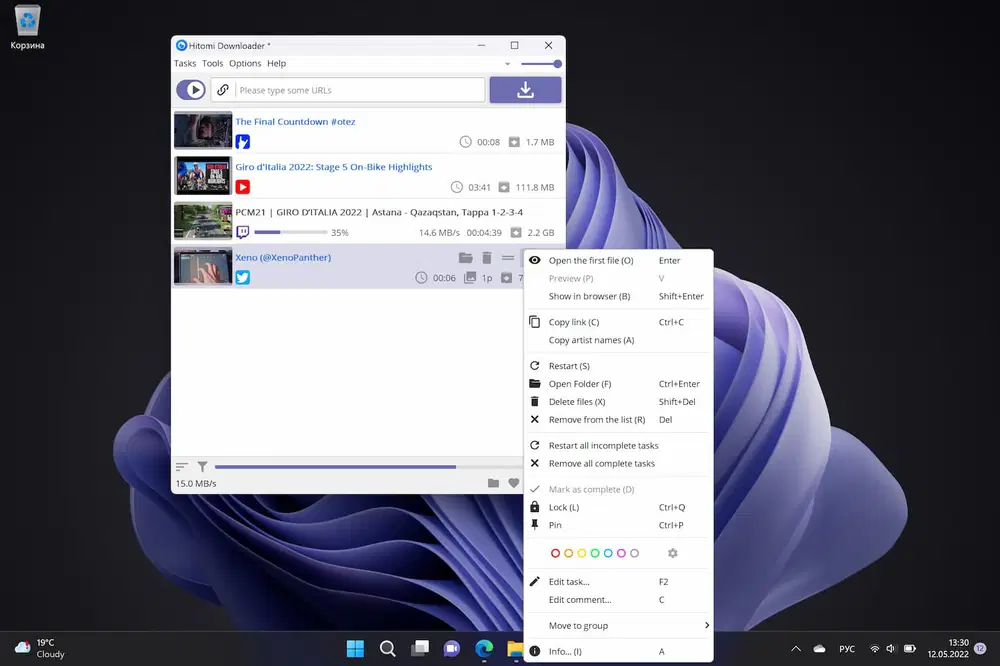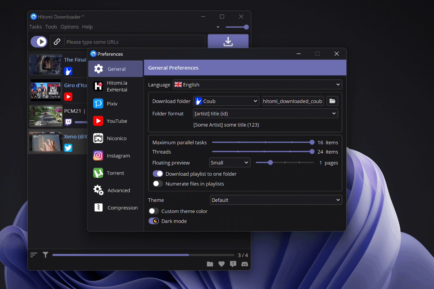 Hitomi Downloader может отслеживать буфер обмена на наличие URL-адресов поддерживаемых сервисов, поддерживает светлый и темный режимы, экспорт и импорт задач, а также предлагает ряд настроек интерфейса.