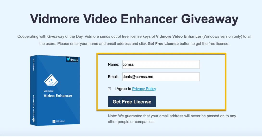 - Вы получаете бесплатную лицензию Vidmore Video Enhancer на 1 год для одного Windows ПК. Срок действия лицензии начинается с момента получения.