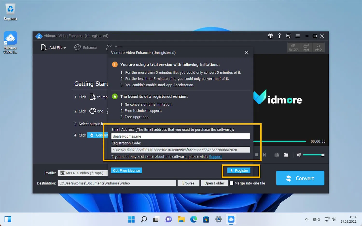 Для того, чтобы бесплатно получить лицензию Vidmore Video Enhancer на 1 год выполните следующие действия:
