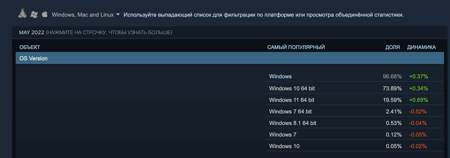 Доли старых версий Windows в мае немного просели, а их общая рыночная доля составляет чуть более 3%. В целом, 96,68% (+0,37%) пользователей Steam предпочитают Windows другим операционным системам. Доля Apple macOS от Apple составляет 2,20% (-0,35%), а Linux занимает третье место всего с 1,12% (-0,02%).
