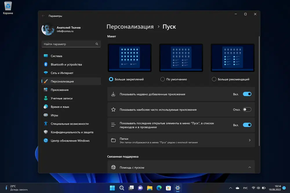 В Windows 11, версия 22H2 Microsoft представляет макеты меню «Пуск». Поддерживается три различных макета: макет по умолчанию, макет с увеличенным разделом закрепленных приложений и макет с увеличенным разделом «Рекомендуем».