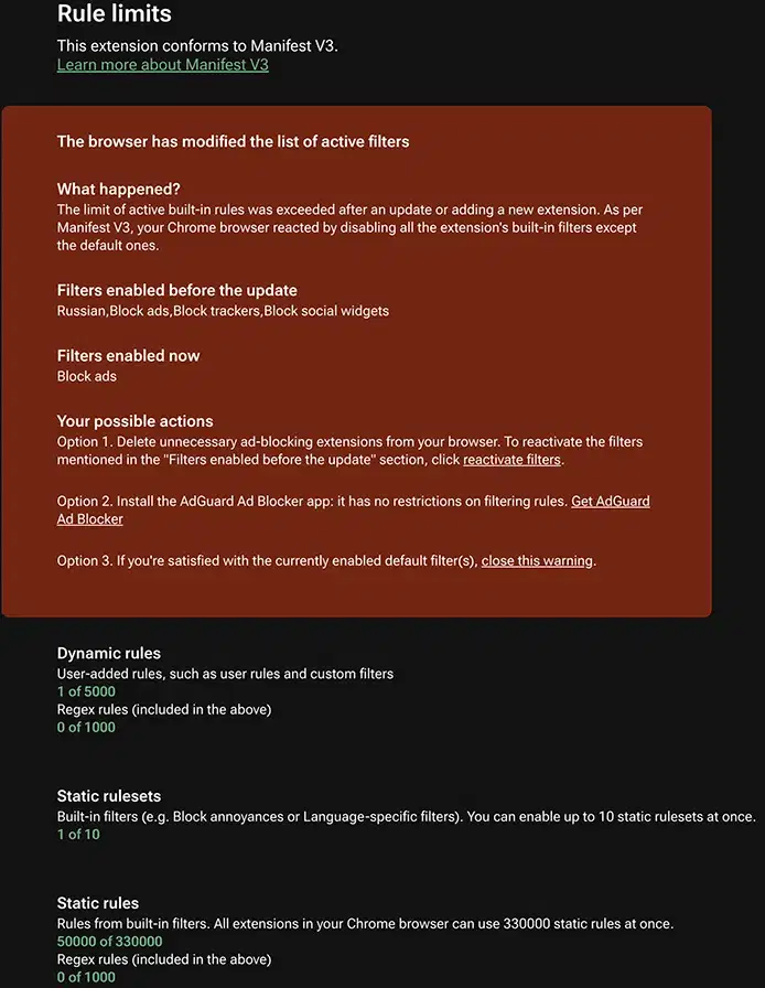 Если это произойдет с расширением AdGuard (причем это может произойти в любое время после обновления, перезапуска сервис-воркера, изменения набора фильтров в расширении AdGuard или в стороннем расширении), то появится сообщение о том, что браузер изменил список активных фильтров и оставил включенным только базовый рекламный фильтр AdGuard. В самом худшем сценарии даже базовый фильтр может так и не включиться, если он содержит более 30000 правил. В результате пользователь останется без защиты AdGuard.