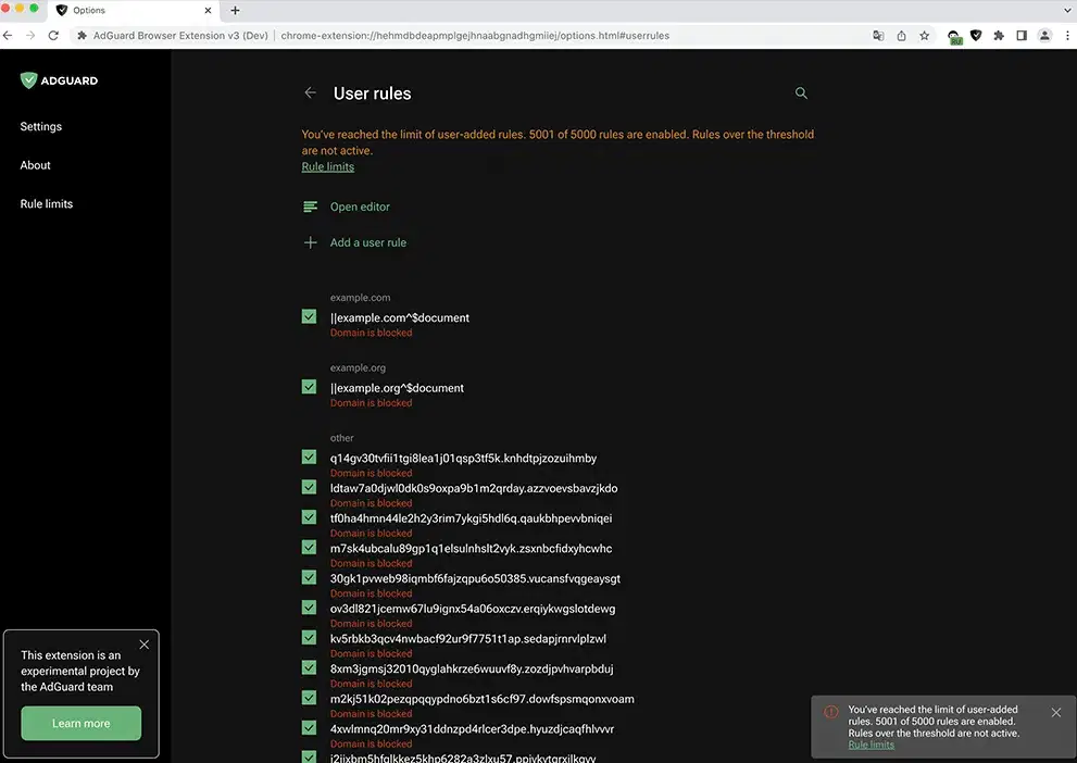Что касается динамических правил, с помощью которых пользователи могут добавлять собственные правила и фильтры, то для них установлен мизерный лимит в 5000 правил, включая лимит в 1000 правил с регулярными выражениями. При превышении данного лимита AdGuard MV3 сможет применить только первые 5000 правил, а остальные не будут браться в расчет.