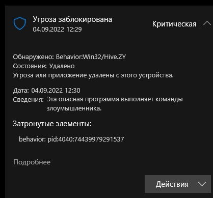 Проблема возникла в воскресенье утром, когда Microsoft выпустила обновление сигнатур 1.373.1508.0 для встроенного антивируса Microsoft Defender в Windows 10 и Windows 11, включающее два новых обнаружения угроз, в том числе Behavior:Win32/Hive.ZY.