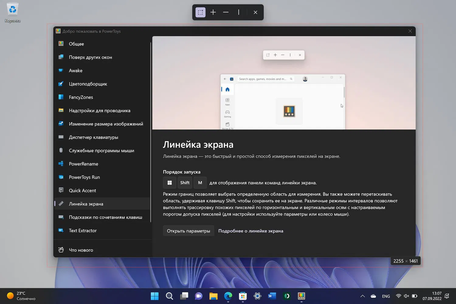 Наконец, третий инструмент — Линейка экрана. Данный инструмент позволяет быстро измерить пиксели на экране. Утилита включена по умолчанию и вызывается по сочетанию Win+Shift+M.