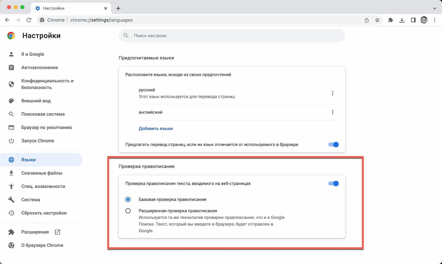Пользователи Chrome могут включить расширенную проверку правописания на странице настроек языка: меню > Настройки > Языки или по прямой ссылке chrome://settings/languages.