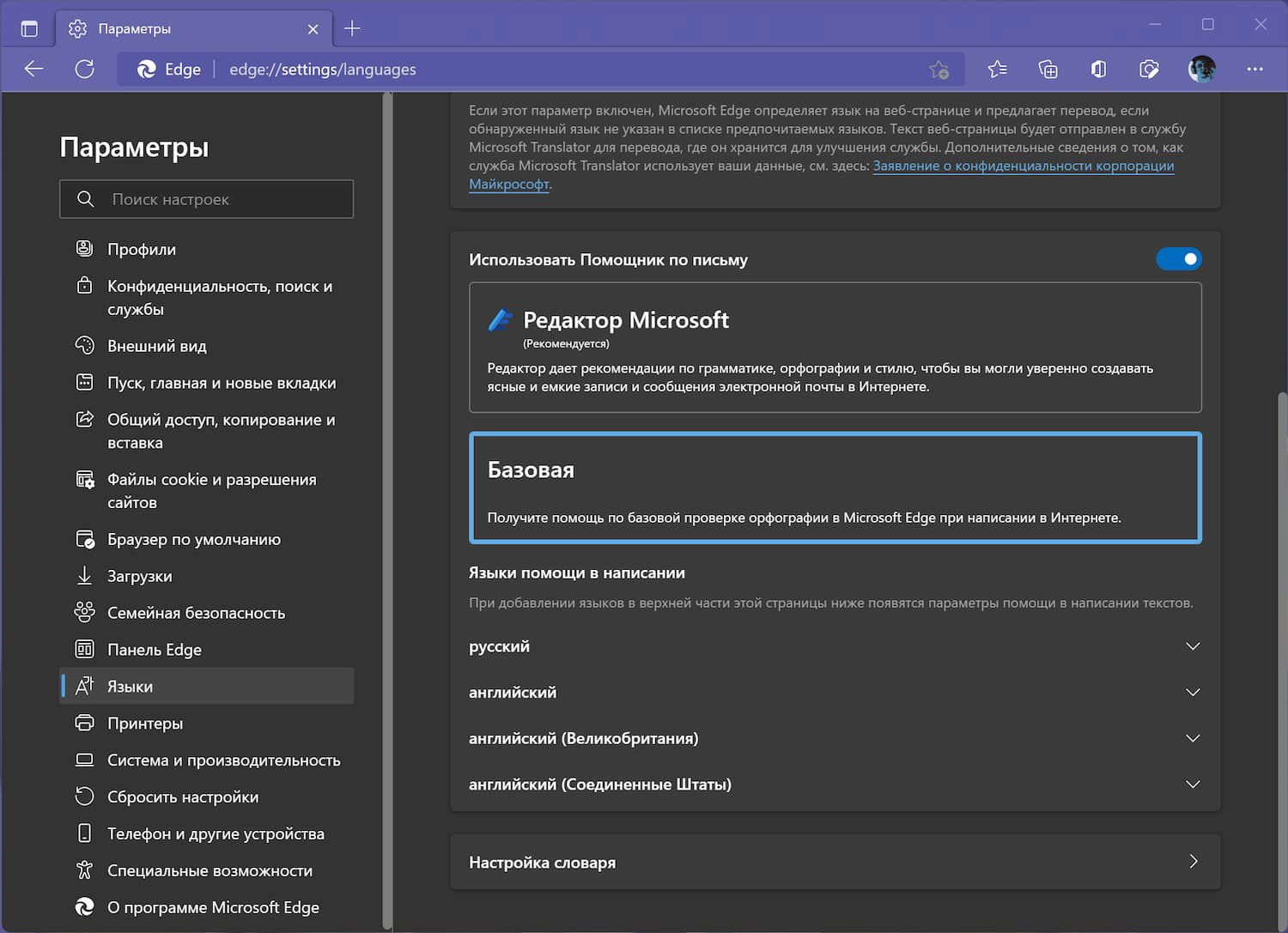 edge://settings/languagesили выберите Меню > Настройки > Языки. - Найдите на странице группу параметров Использовать Помощник по письму