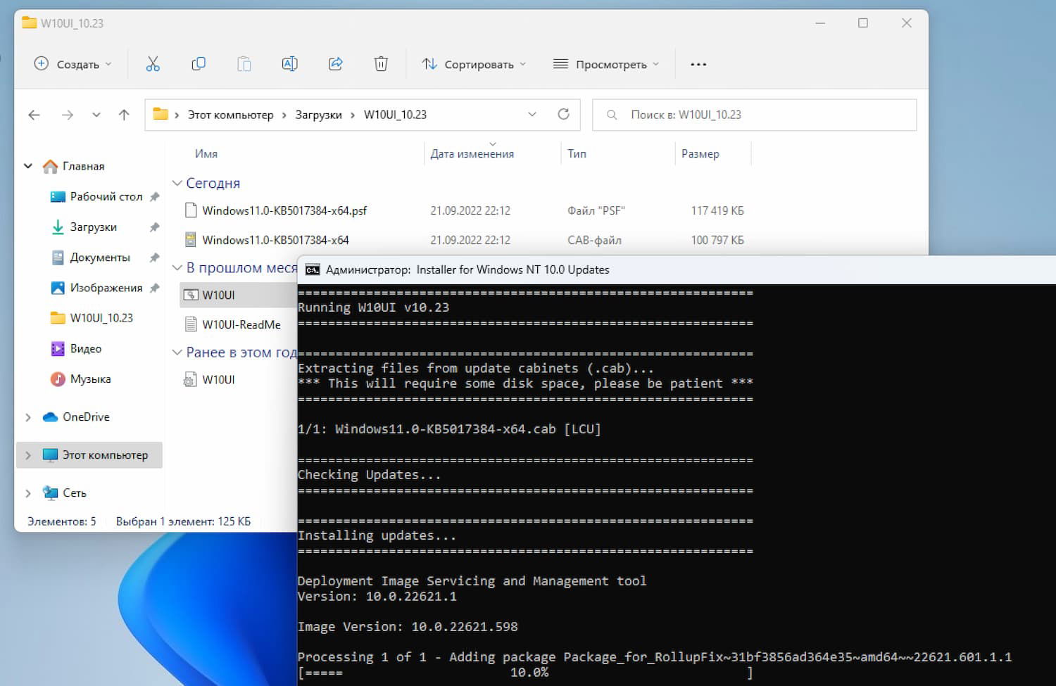 - Скачайте два файла обновления KB5017384 (.CAB и .PSF) для выбранной платформы (x64 или ARM64) и поместите в папку W10UI_10.24.
