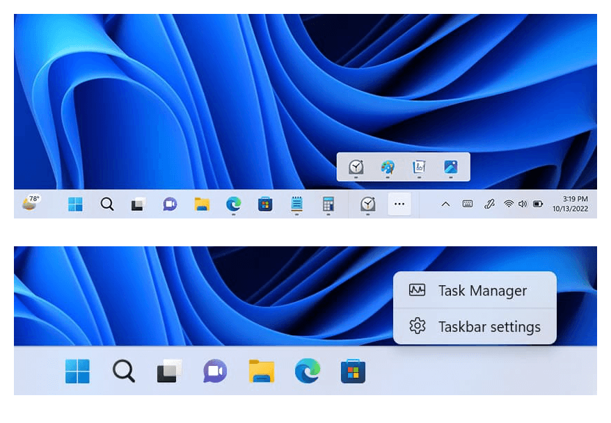 - Панель задач: новая опция переполнения добавляет в меню все значки панели задач, которые не видны на самой панели задач. Подходит для устройств с небольшим разрешением и переполненными панелями задач. Щелчок правой кнопкой мыши снова отображает ссылку на Диспетчер задач, который Microsoft удалила в исходной версии Windows 11.