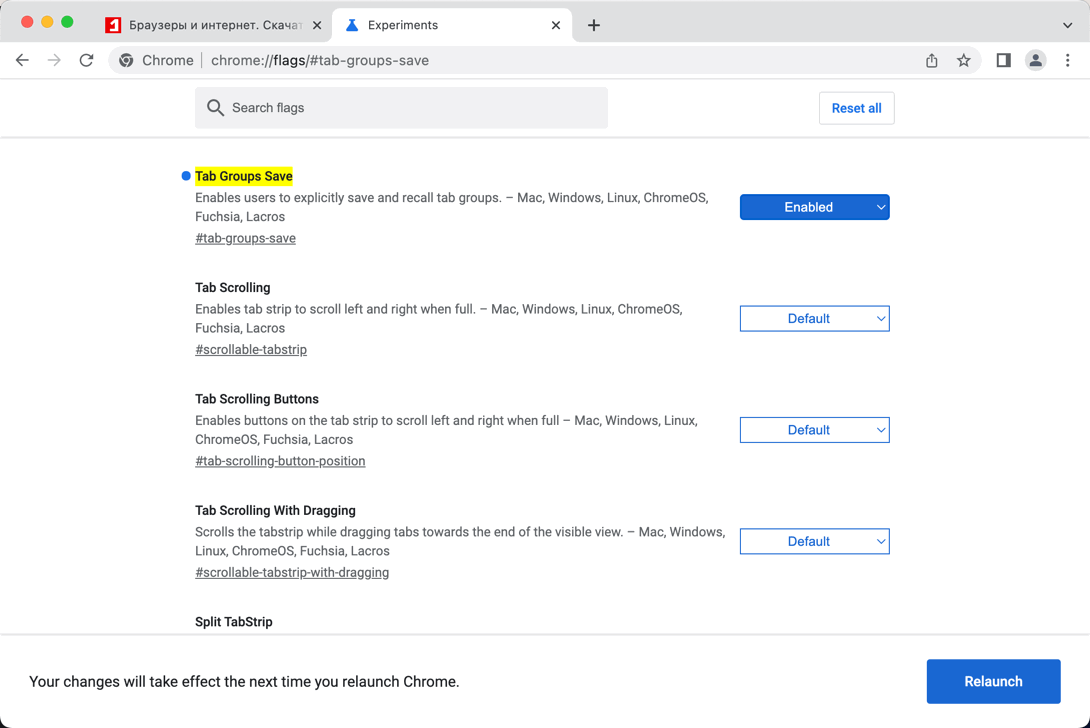 chrome://flags/#tab-groups-save - Установите параметр Tab Groups Save в значение Enabled.
