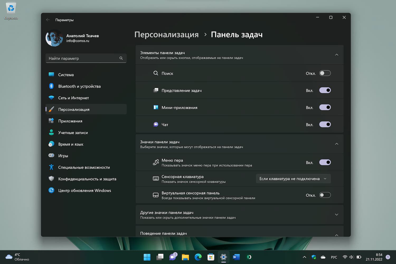 • Щелкните правой кнопкой мыши по свободному пространству на панели задач Windows 11 и выберите опцию Параметры панели задач. В качестве альтернативы можно перейти в приложение «Параметры» > Персонализация > Панель задач.
