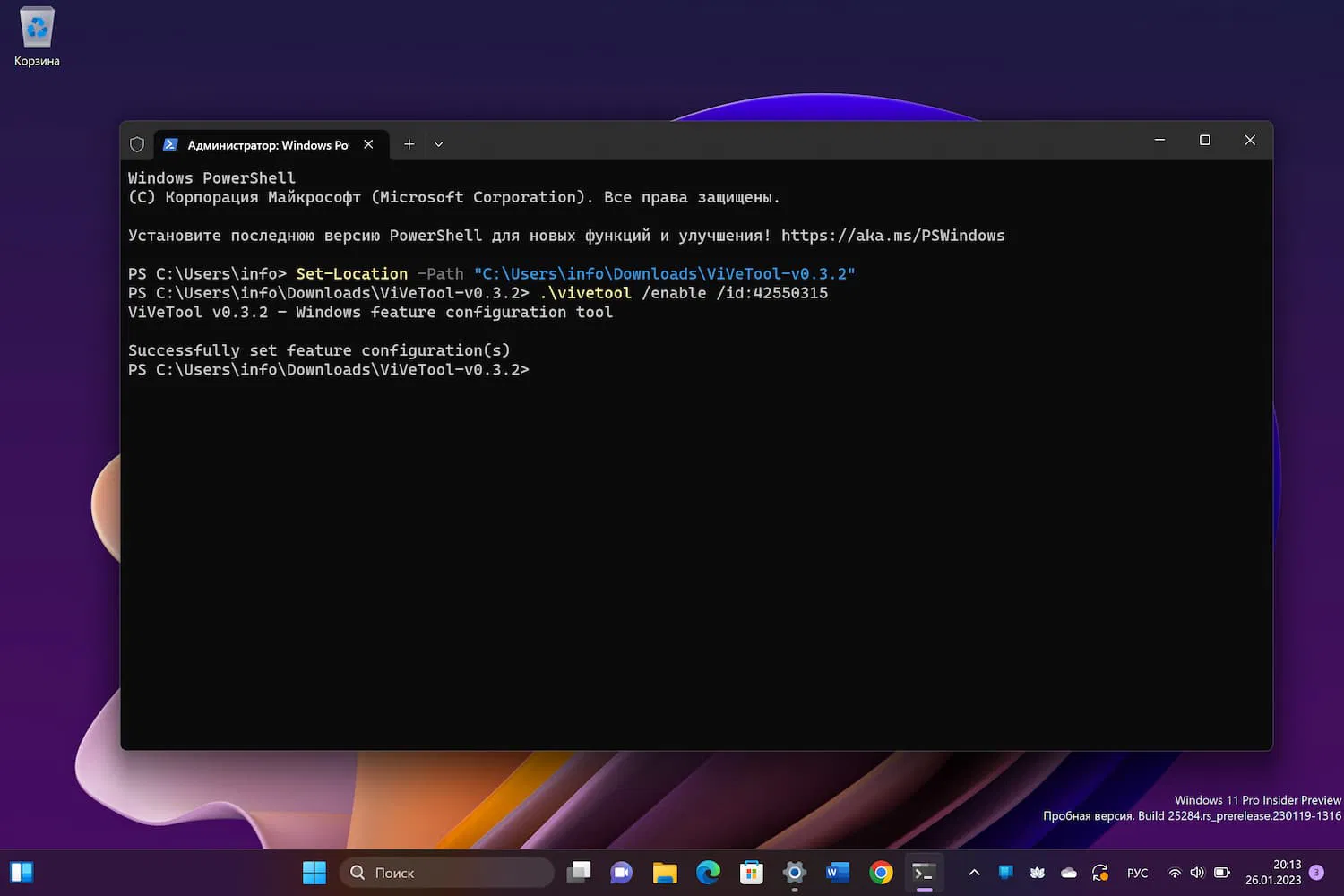 В примерах используются команды в Терминале для профиля PowerShell . Если вы используете профиль Командная строка, замените начальную команду .\vivetool на vivetool.