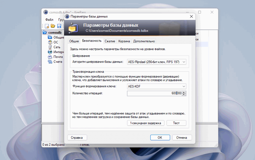 Второй вариант повышения безопасности паролей в KeePass — изменить функцию формирования (деривации) ключа и изменить ее количество итераций.