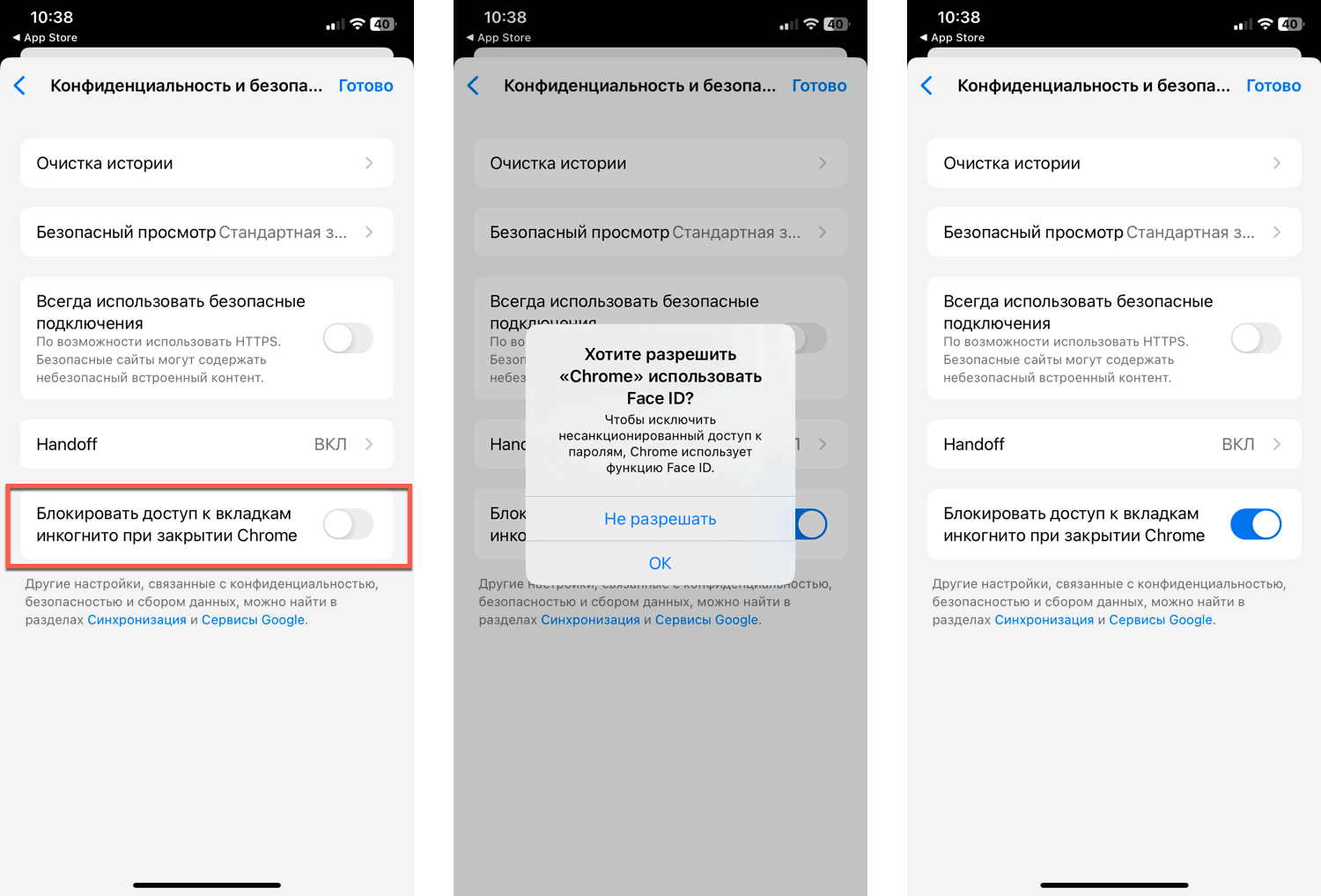 На этом процесс настройки завершен. Теперь при выходе из браузера Chrome все, кто попытается получить доступ к вкладкам "Инкогнито" при повторном открытии приложения, должны будут пройти аутентификацию с помощью Face ID или Touch ID, обеспечивая конфиденциальность и безопасность вашей работы в интернете.