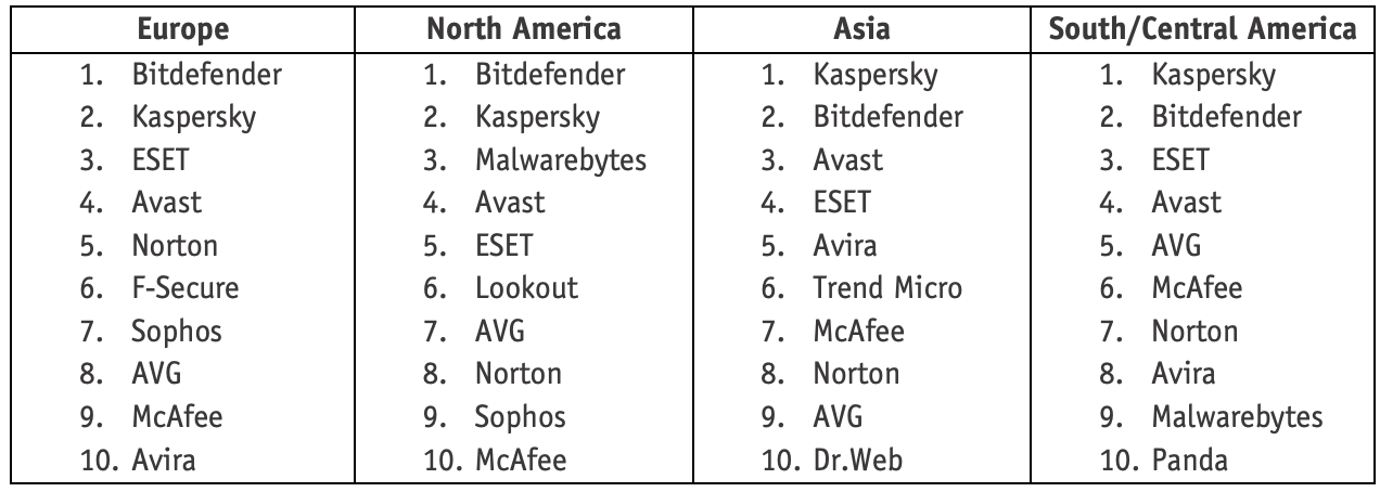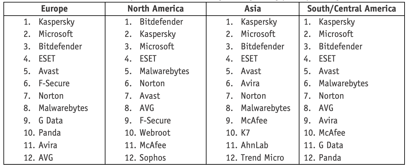 - Kaspersky, Microsoft, Bitdefender и ESET (в таком порядке) - четыре наиболее используемых антивируса для настольных компьютеров по всему миру и являются лидерами на всех континентах.