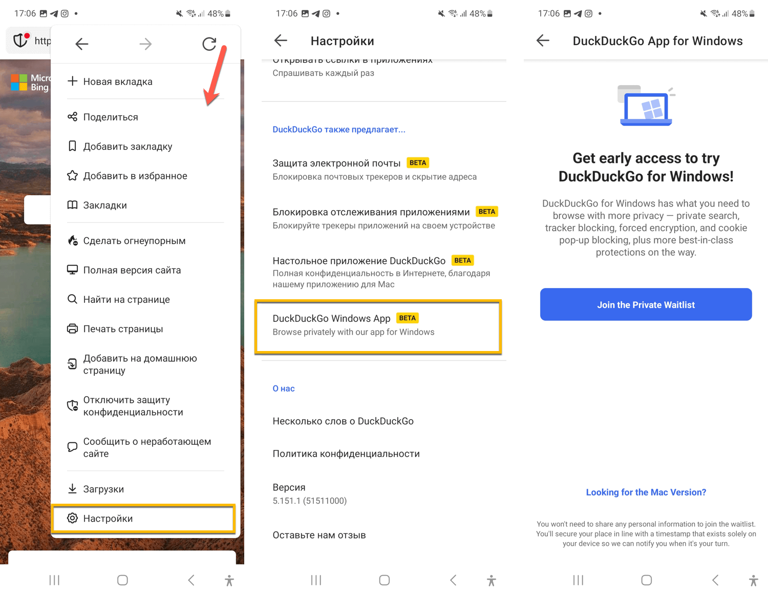Тестирование проходит в закрытом режиме, вам нужно добавиться в список ожидания, чтобы протестировать браузер DuckDuckGo для Windows. Для этого выполните следующие шаги: