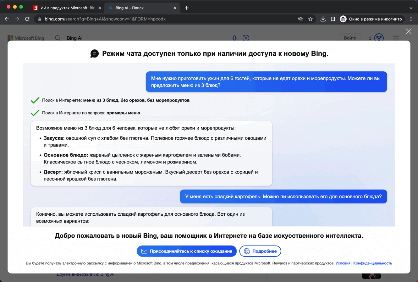При посещении сайта Bing и нажатии на ссылку чата в верхней части веб-страницы, вы по-прежнему можете получить предложение добавиться в список ожидания с описанием того, что для использования режима чата требуется доступ к новому Bing.