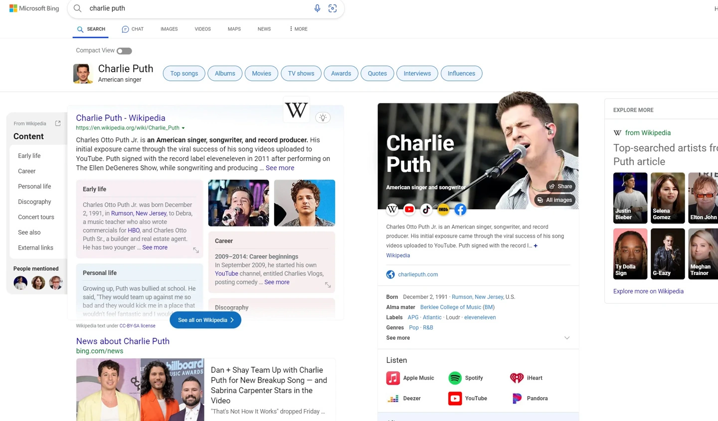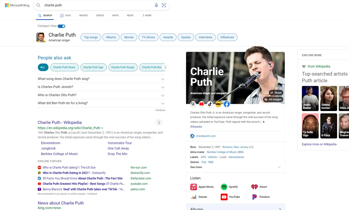 «Компактный вид» скрывает основной контент из Википедии, сокращает количество медиафайлов на странице и удаляет некоторые информационные элементы боковой панели. В результате страница Bing Search больше напоминает классическую страницу с результатами поиска.