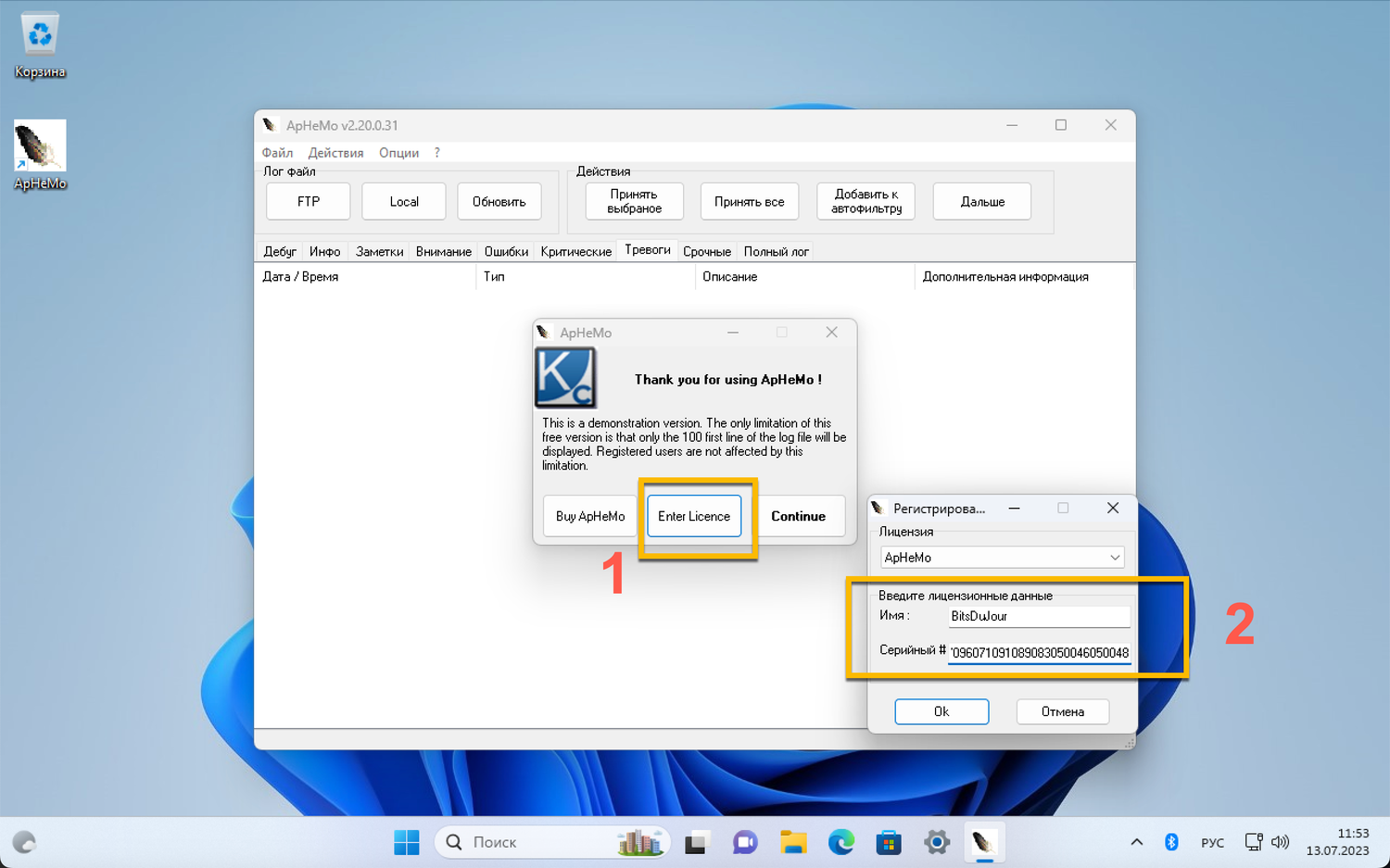 - Активируйте полную версию в меню Enter Licence следующими лицензионными данными: