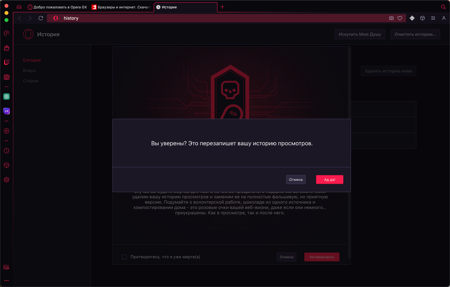 "Искупление души" не ограничивается только автоматическим режимом. Оперу GX можно настроить так, чтобы функция «Фальшивая история» активировалась в любое время, достаточно выбрать галочку "Притворитесь, что я уже мертв(а)". Это означает, что ваша история просмотров может быть очищена и заменена на благородные веб-запросы в любой момент, без ожидания 14-дневного периода неактивности.