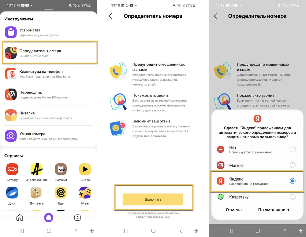 Служба определения номеров обращается только к уведомлениям о звонках в мессенджерах для считывания входящих номеров и сопоставления их с информацией в базе данных. Определитель может определить различные категории звонков, включая мошенничество, спам, рекламу, службы доставки, банки, медицинские учреждения и так далее. Информация для этой службы поступает из открытых источников, от партнеров «Яндекса», а также учитываются отзывы пользователей.