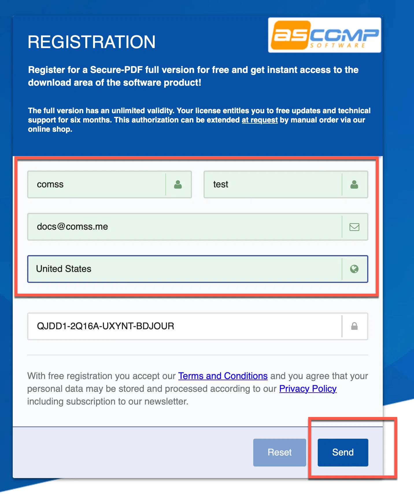 Для получения бесплатной лицензии ASCOMP Secure-PDF Professional выполните следующие действия: