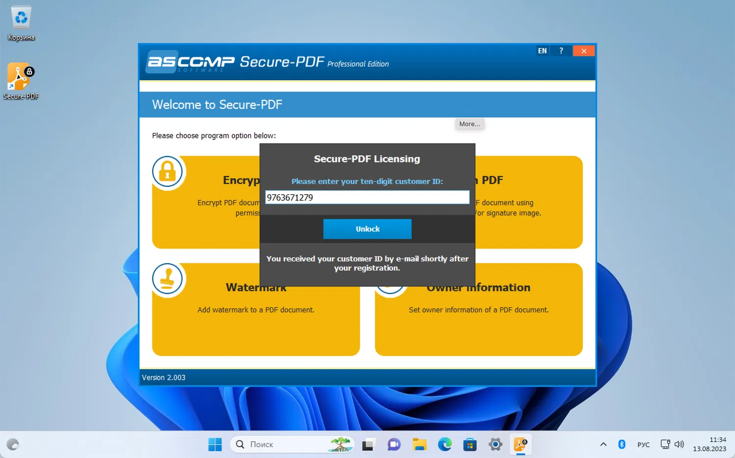 - После установки ASCOMP Secure-PDF Professional введите полученный Customer ID, чтобы активировать полную версию.