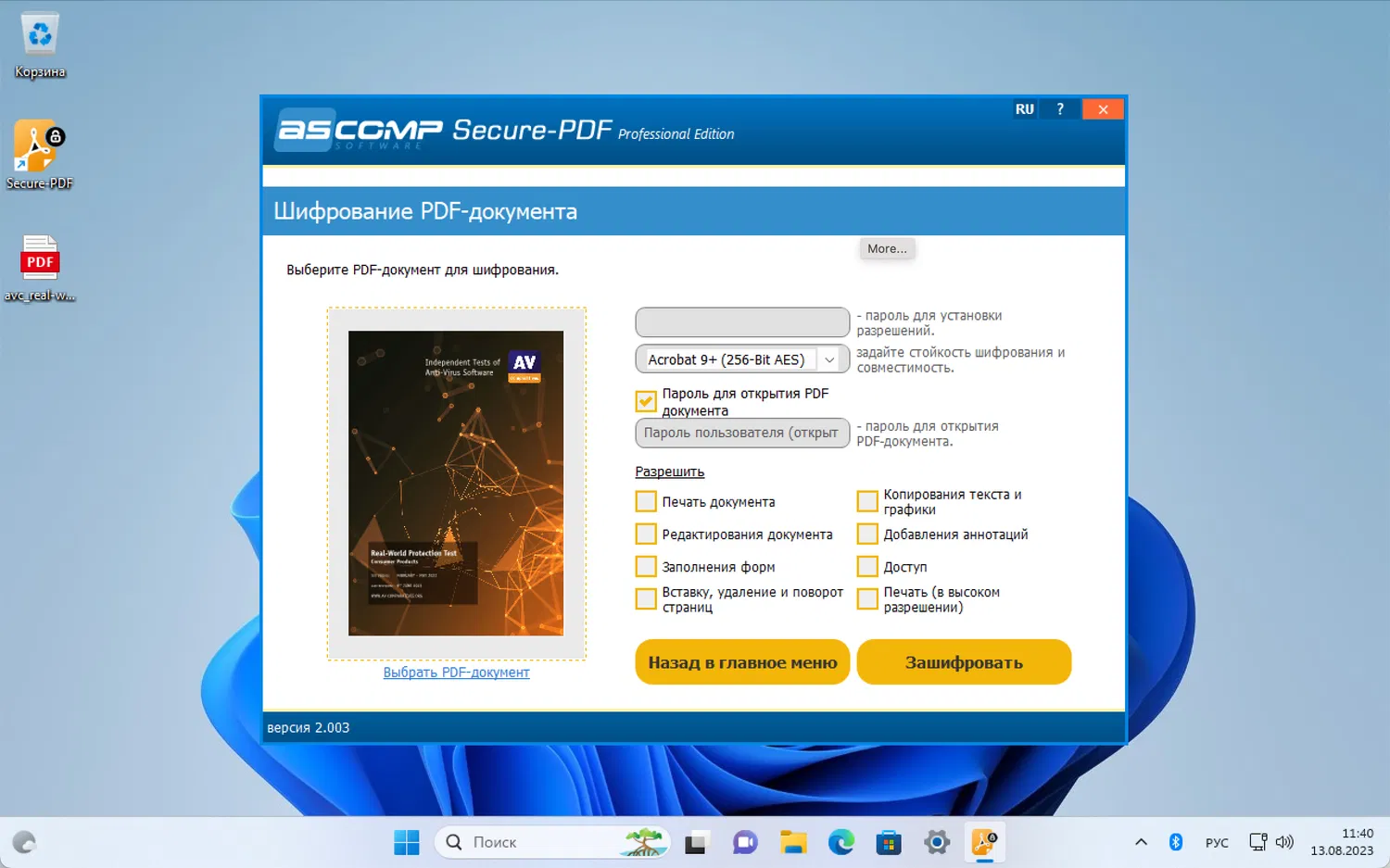 - Шифрование PDF-документов: Secure-PDF предоставляет возможность шифровать PDF-документы с использованием ключа длиной до 256 бит (AES), что делает ваши документы безопасными от несанкционированного доступа.