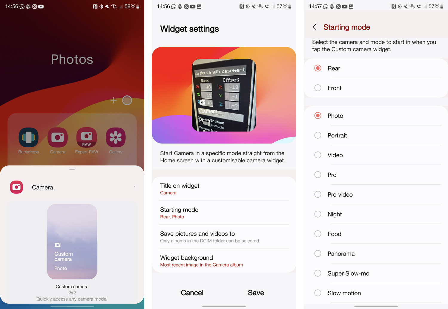 - Пользовательские виджеты камеры: Теперь вы можете добавлять на домашний экран виджеты камеры. Каждый виджет может быть настроен для запуска в конкретном режиме съемки и сохранения фотографий в выбранном вами альбоме.