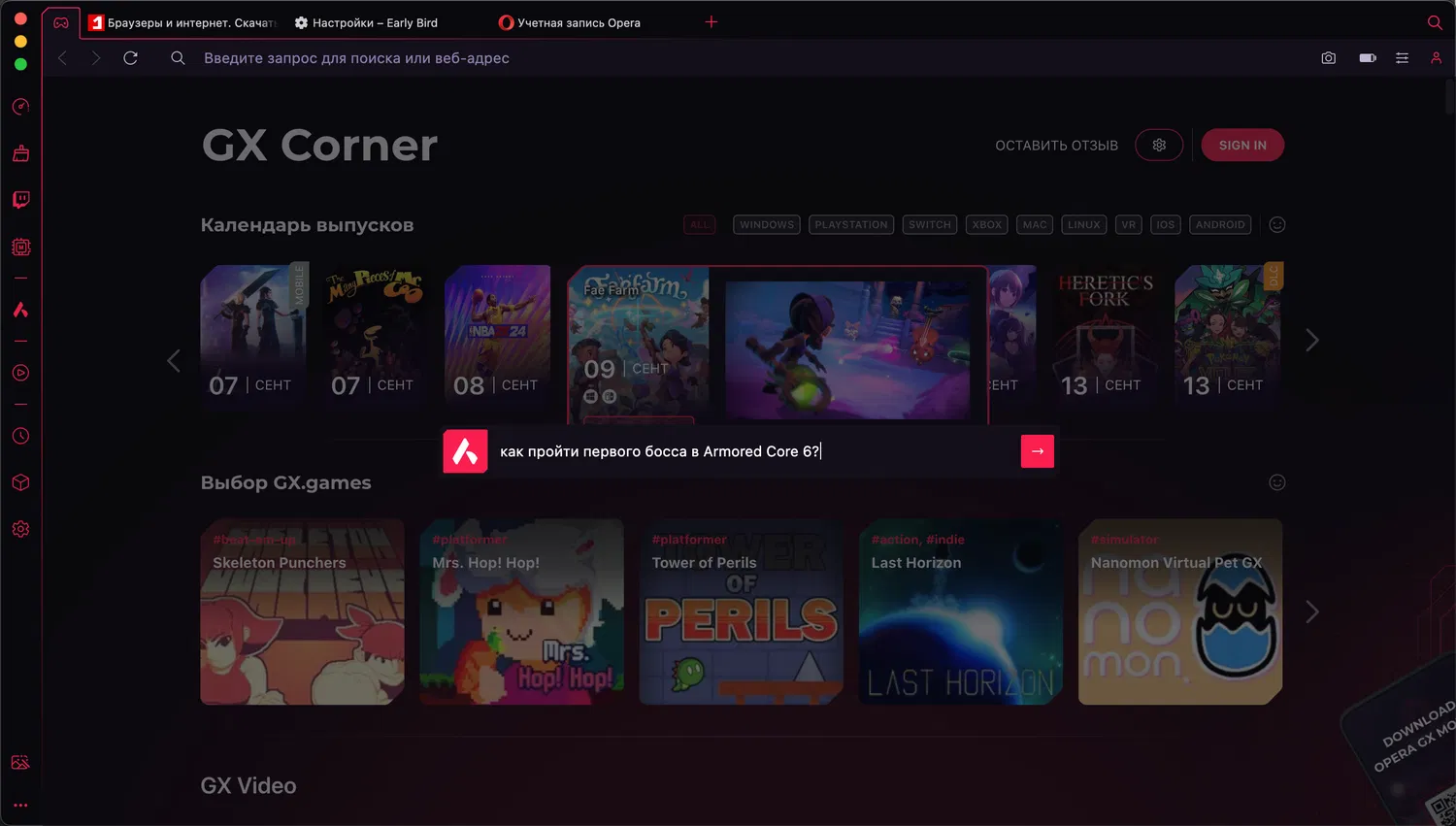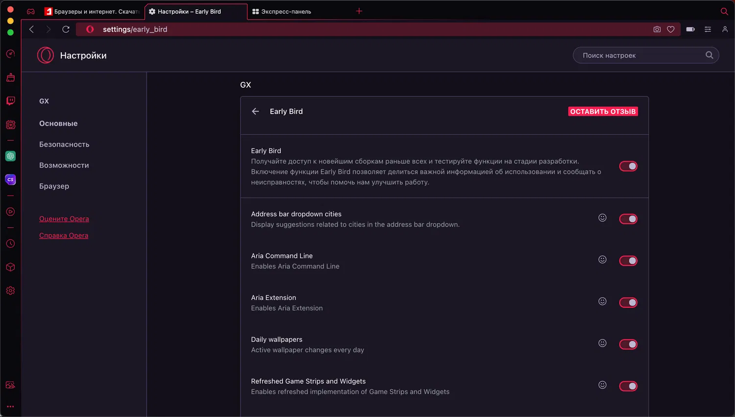 Для использования Aria необходимо включить в настройках функцию Early Bird на странице opera://settings/early_bird. Вы можете использовать Aria в Opera GX абсолютно бесплатно — потребуется только выполнить вход в учетную запись Opera.