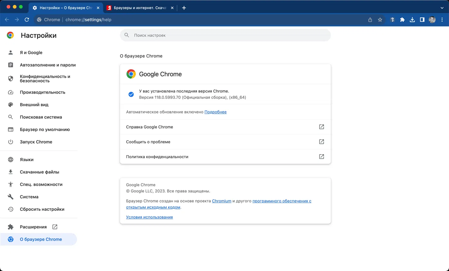 Чтобы проверить версию Google Chrome, перейдите в меню > Справка > О браузере Google Chrome или откройте страницу chrome://settings/help. Если обновление доступно, то браузер автоматически скачает и установит свежую версию. Для завершения установки обновления потребуется перезапуск браузера.