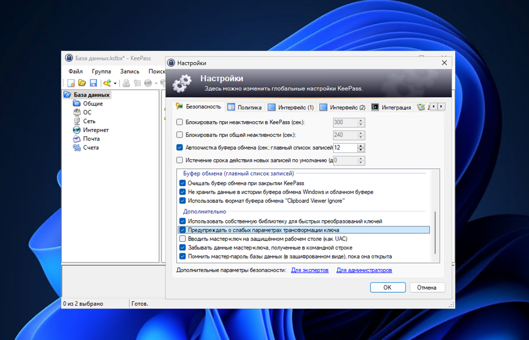 KeePass 2.55 — небольшое обновление с важными улучшениями безопасности. В нем увеличено количество итераций одного из основных алгоритмов шифрования, а также добавлено предупреждение о слабых параметрах трансформации ключа. Всего за один клик вы можете увеличить количество итераций в базе данных, чтобы повысить защиту от атак методом перебора.