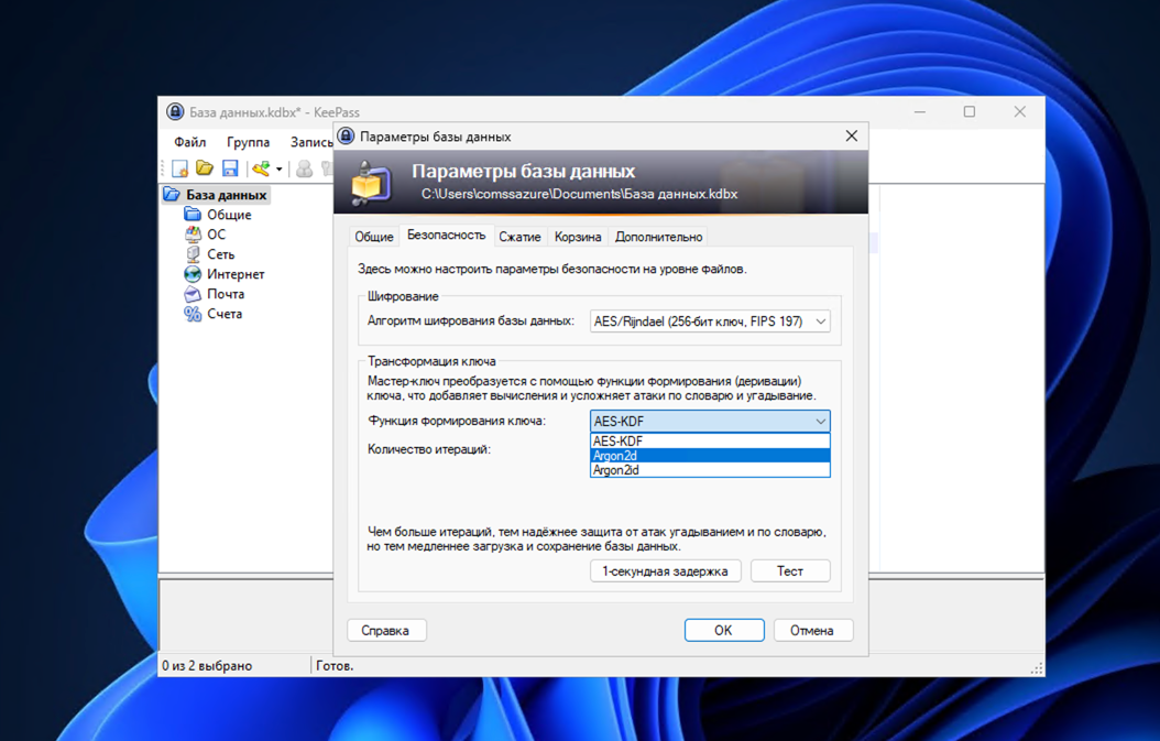 При выборе пункта меню Файл > Параметры базы данных > Безопасность в KeePass отображается текущий используемый алгоритм шифрования и доступна возможность изменить количество итераций или полностью перейти на другой алгоритм. Рекомендуем увеличить количество итераций для AES-KDF или перейти на Argon.