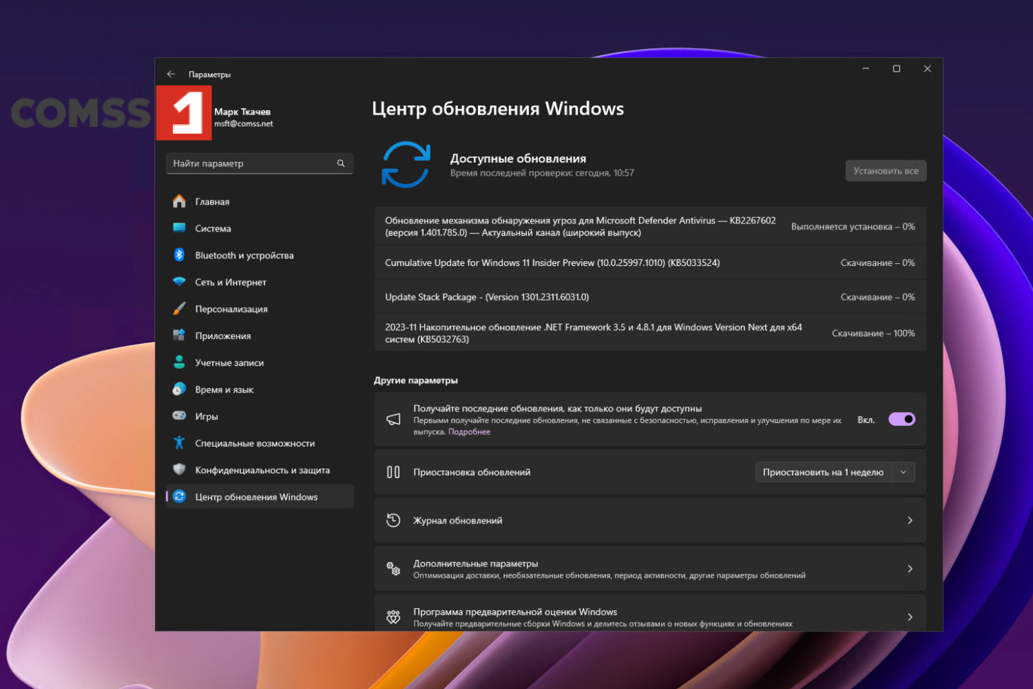 Перейдите в меню Параметры > Центр обновления Windows и нажмите Проверить наличие обновлений. Для завершения установки потребуется перезагрузка компьютера.
