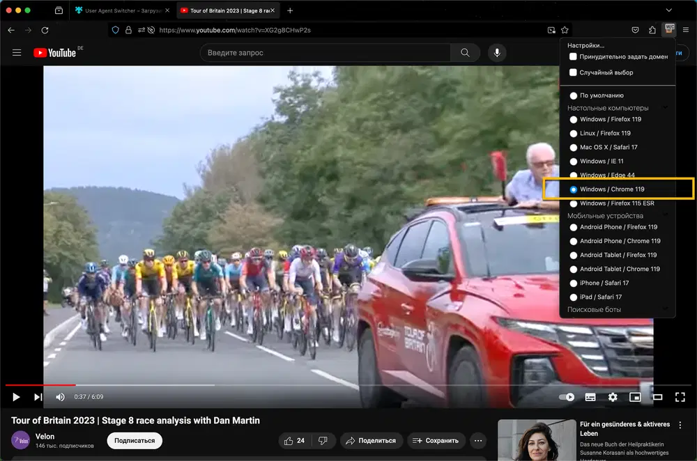 После установки расширения загрузите YouTube в новой вкладке. После загрузки активируйте значок расширения в браузере и выберите Chrome в качестве агента пользователя. Загрузите несколько видеороликов, чтобы проверить, улучшилась ли отзывчивость YouTube.