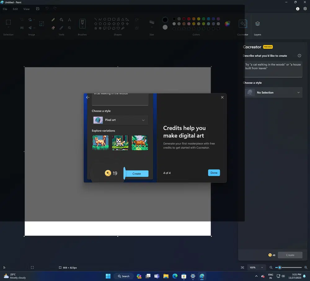 Чтобы использовать эту функцию, вы можете открыть пустой экземпляр Paint и нажать кнопку Cocreator в правой части панели инструментов. Затем вы вводите запрос с описанием того, чтобы вы хотели видеть, а остальную работу сделает ИИ.