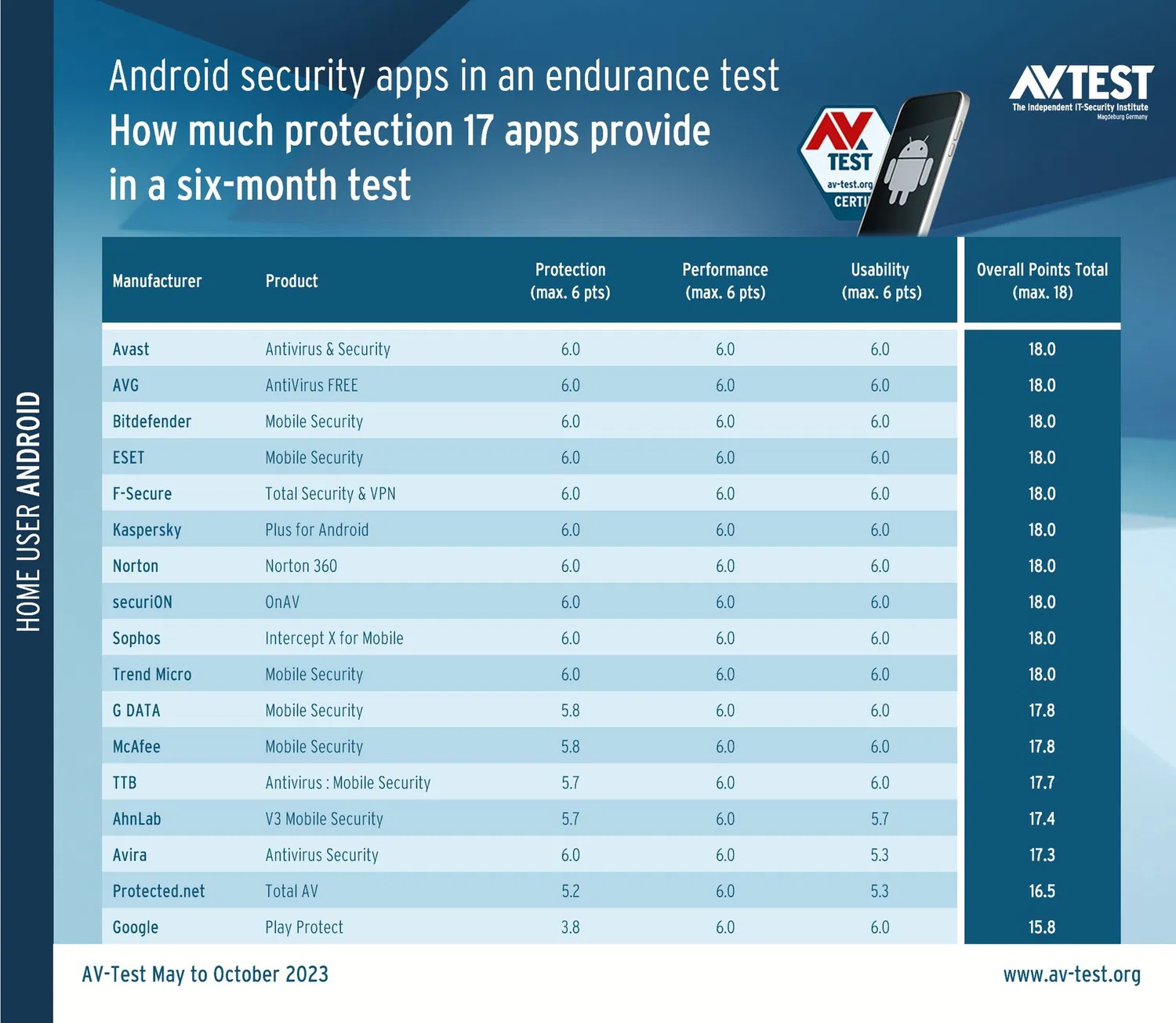 Длительное тестирование, проходившее с мая по октябрь 2023 года, наглядно показывает, какие антивирусы для Android обеспечивают надежную защиту пользователей. 10 из 17 продуктов набрали максимальные 18 баллов: Avast, AVG, Bitdefender, ESET, F-Secure, «Лаборатория Касперского», Norton, securiON, Sophos и Trend Micro. Еще пять антивирусов набрали не менее 17 баллов, а Protected.net — всего 16,5 балла. Встроенное в Android решение Google Play Защита не выдержало конкуренции и заняло последнее место, набрав 15,8 балла. Такой результат дает четкий ответ на вопрос, достаточно ли стандартной защиты на Android-устройстве.