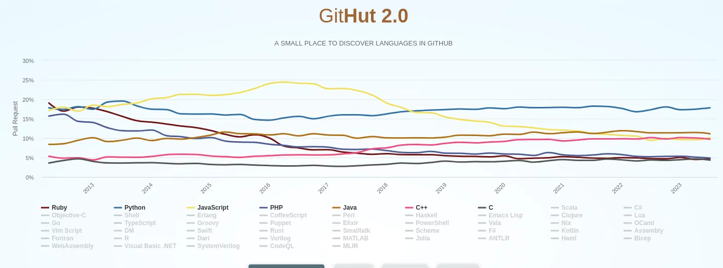 PHP, долгое время занимавший лидирующие позиции в веб-разработке, теперь находится на седьмом месте с популярностью 4,8%. Ruby занимает восьмое место с 4,7%. Замыкают десятку самых популярных языков на GitHub C и C#.