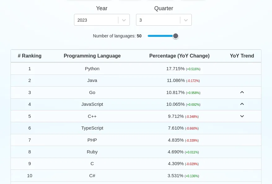 Java сохраняет свою позицию на втором месте, несмотря на небольшое снижение популярности, с долей использования чуть более 11%. В то же время, Go стремительно поднимается в рейтинге, занимая третье место и уступая Java всего на 0,3%. JavaScript, ранее непререкаемый лидер, испытывает заметное снижение популярности, но все еще занимает сильные позиции. C++ и TypeScript располагаются на пятом и шестом местах соответственно.