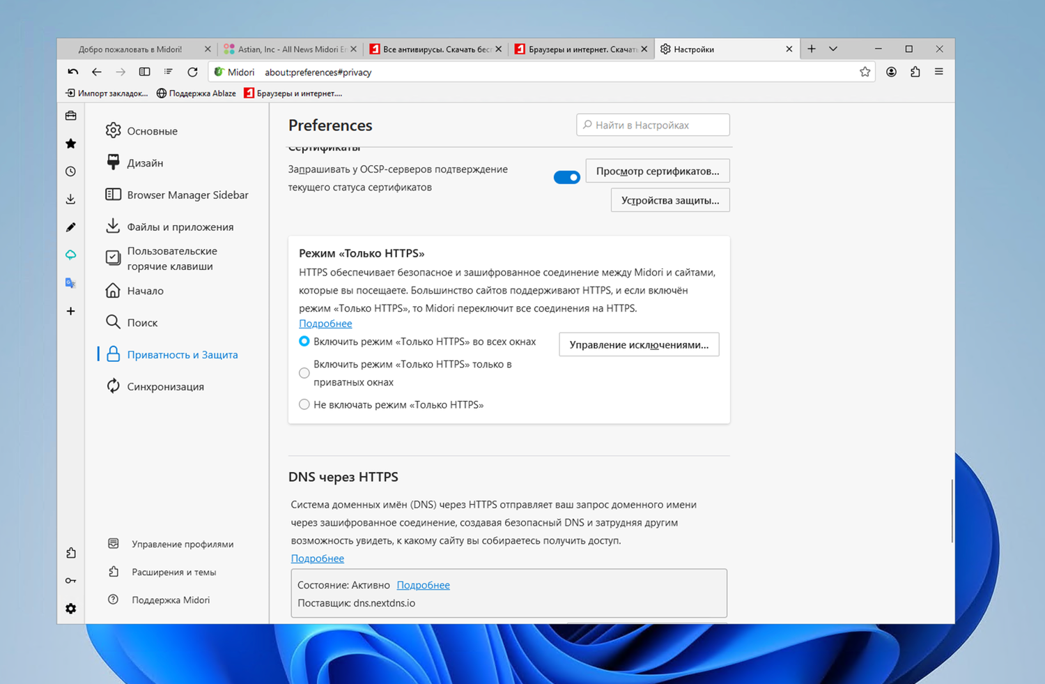 • DoH активирован по умолчанию: Включение MidoriDNS по умолчанию для улучшения безопасности и конфиденциальности.