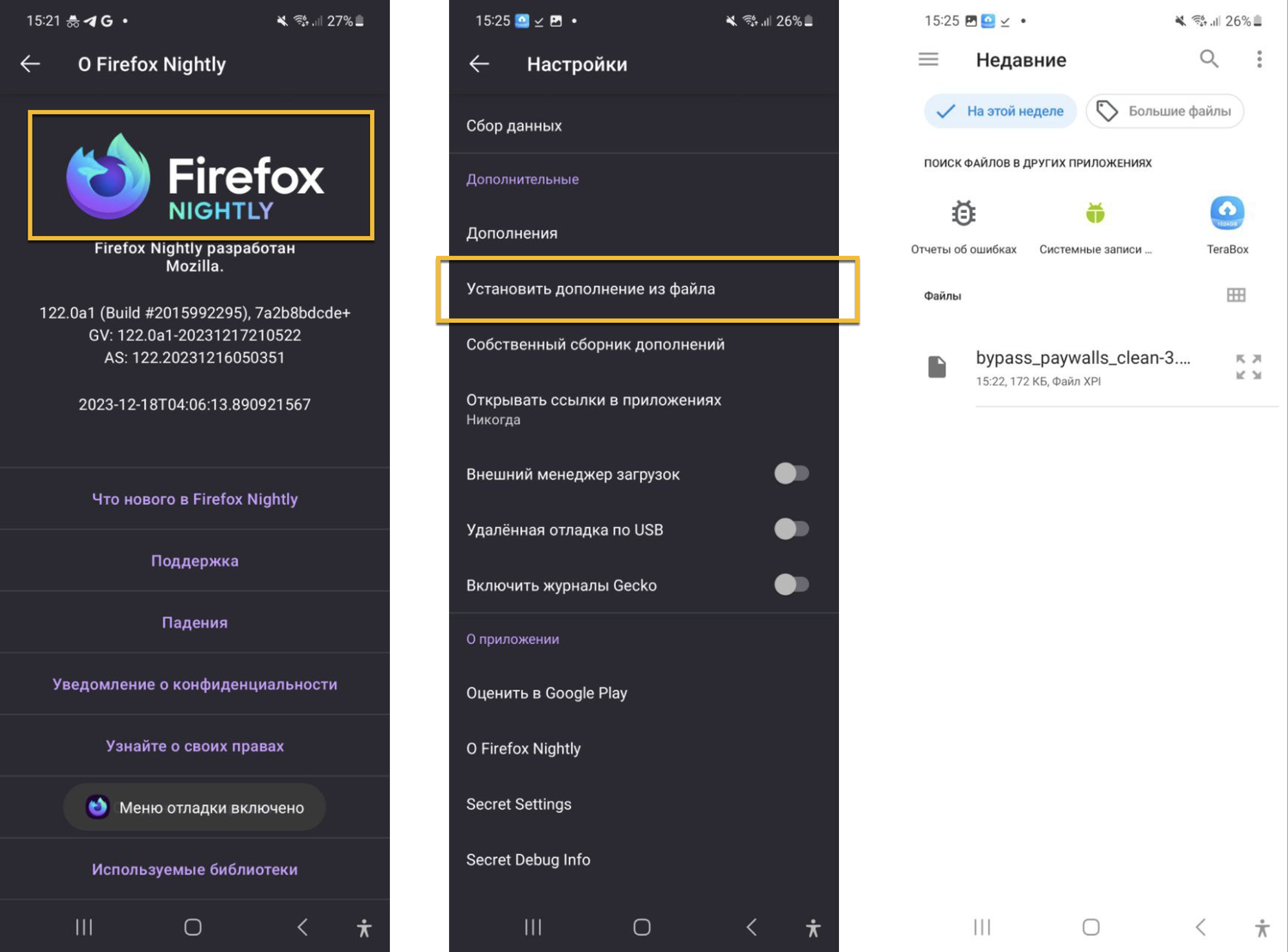 Примечание. По умолчанию опция установки дополнений из файлов недоступна. Mozilla ее скрыла, но вы можете разблокировать ее в меню секретных настроек. Для этого откройте Firefox Nightly на смартфоне Android и перейдите в меню > Настройки > о Firefox Nightly. Нажмите на логотип Firefox Nightly 5 раз, и на экране появится сообщение Меню отладки включено. Теперь у вас есть доступ к меню секретных настроек и новой функции.