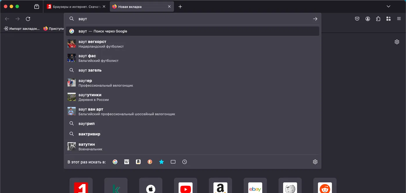 - Предложения статей MDN Web Docs: При поиске информации, связанной с веб-разработкой, браузер предлагает статьи с сайта MDN Web Docs.